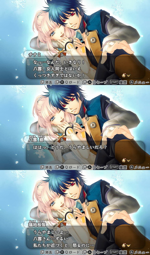 残骸孤独こそ真実PAGE | 109 108 107 105 103 102 101 99 98 97 90 | ADMIN | WRITE 2011.03.06 Sun 01:03:06 遙か5感想?我感觉我好像又好久没更新了,所以决定写点东西让这个bo别长草。 PS:後面寫累了所以很簡略不排除我什麼時候無聊改一下。 从2.24开始基本就集中在游戏上,遥5和WC2011同一天出,虽然本意是想先搞定WC2011的,结果破解出得晚,只好先开了遥5。 这么说吧,虽然我勉强算是遥远系列的fan,但是我基本是从遥3开始喜欢上,然后遥4大失落,结果遥5我基本只看了看神子长啥样就没再关注情报了,所以我对这款游戏没有任何期待,大概也正因为如此我还蛮喜欢它的吧。 在翼梦上稍微看了一下关于遥5的感想,基本都是骂声一片,之前和阿C姑娘聊的时候,她也很惊讶地说我是她看到的第一个喜欢遥5的人,导致原本还有点庆幸没丧失乙女心的自己开始怀疑现在身体里的乙女成分还能剩下多少囧,不过好在至少我还不是唯一一个人,帆跟我也一样,喜欢遥5多于遥4,才让我感觉自己只是脱离了大众还不至于审美异于正常人…… 在说每个人的感想之前稍微提下其他。 我乙女游戏玩的不多,暗荣的新罗曼史系列中只有遥远我基本全部玩过,金弦只玩过两代但都是只跑过一两个人结局的,安琪系列只尝试过古老的1代和PSP上的新安琪,非暗荣作品的话也只对过去某些不怎么有名气的作品有印象,至于好评很多的维他命啊星座彼氏都没玩,所以参照应该基本都是遥远系列。 音乐的话本作并没有什么特别印象深刻的曲子。 战斗系统除了连锁技以外也跟三代蛮像,不过一二代应援搭配简直太麻烦,四代一对一面对面战斗简直太白痴所以其实五代这个战斗我还蛮能接受…… 剧情的话感觉有在向三代致敬,但基本还不至于构成太重复的既视感所以我都还能接受,至于恋爱线的感想就放在和人物感想一块说好了。 首先可以确定的是,遥5的人物塑造在我眼里算比较成功的,特色鲜明。 而我在这代里面喜欢的角色也还挺多。 从女主YUKI说起。 基本上在外面看到恶评最多的就是这个女孩子了,但是我真的觉得她还蛮可怜的。 天真是正常的,被两个保护欲那么强的家伙守着,家里又是很有钱的样子,没娇纵只是有点天真迟钝已经在我接受范围内了。圣母就圣母吧,说真的这年头女主圣母也不罕见,不圣母的话,怎么可能会有牺牲自己来拯救两个世界的觉悟? 我觉得YUKI在五代的神子中已经是比较苦逼的了,虽然两个保护欲超强的跟了过来,但是直到一周目最后八叶没一个愿意承认自己身份的,结果作为神子的这姑娘就为了挽回自己的世界跟着大家到处跑,中途夹杂各种莽撞事件,最后打boss的时候还被所有人一起卖了个人情,结果一个人回到了现代。 想想不能说她无辜,但是倒是没有选择,人也好情势也好神也好都逼着她走,感觉一路上根本没有太多选择余地。虽然最后回到现实以为自己摆脱了噩梦这个常理之中的反应多少让我有点不满,不过最后对着白龙许愿说就算牺牲生命也要救两个世界的时候好感就回升了。 这么说五代神子也就她是要靠削减生命来穿越的了,想想比前辈们辛苦多了。所以其实我喜欢她大概比千寻多,虽然理所当然比不上望美。 回档是从7章开始,对这点其实我很不满因为假如想重温之前的剧情岂不是得从头再打起,那多累。 然后回档以后因为知道未来可能的走向所以剧情跟一周目不同了这很正常。那么个人感想就按着我的攻略顺序说好了。 第一个完毕的是高杉线。 本来我第一个目标是福地的但是一不小心走到高杉事件他摆出这样的脸说跟我一起走好吗我简直无法拒绝。 对高杉的初步印象是冷面,结果事实上这家伙明明可以很温柔还很文艺,所有恋爱路线中风花雪月全齐全的就只有这家伙了!在YUKI说自己喜欢春风的时候调笑她说自己的名也是春风,弹三味线的时候还唱三千世界鸦杀,庆功宴一个人去外面喝酒还说举杯邀明月对影成三人,你能不能别这么文艺w! 不过我很喜欢他,政治理念算是所有的家伙中我最能接受的了,这条路线中YUKI的表现也挺不错,两个人有点像是志士夫妇一样。顺便使用生命碎片的时候,这条线是让我觉得最在情理之中的了。 (對這傢伙的笑容很沒轍) 不过最初我还觉得地玄武怎么都这么苦逼,结果其他人让我大跌眼镜原来大家都一样苦逼。 高杉完毕之后是チナミ线,同样是在走福地路线中一不小心不忍拒绝就开了他的章,于是顺着玩下去了。天朱雀历代都给我和主线关系不大的感觉,这一代也不例外,玩完了依旧觉得一个谜题也没解开不过知道了チナミ的真名也算是个收获?不过即使我这么说チナミ也是我喜好排行的前几名,性格超保守又容易害羞,所以在队伍里经常是被所有人调戏的对象w剧情里还有狗血的失忆桥段ww (要守護的時候也可以很堅強w) (失憶後連頭髮都不會梳了<<喂!) (很喜歡這張) チナミ以后我重走8章准备继续福地,结果一不小心拐进了总司路线,好在这时候我终于意识到每个人的章节不是强制进入,于是开出了总司章节以后我继续跑YUKI的9章,总算进入了福地线。 应该说整个遥5里面我最喜欢的角色就是福地樱智了。 虽然毫无疑问是个变态(咦)对YUKI一见钟情,有跟踪狂倾向,被YUKI碰到一下就可以幸福得要死去一样还写YUKI的观察日记但是毫无疑问是个美人(喂) (害羞的跟蹤狂) 在共通章节里面基本只要福地一出场整个剧情就演变为欢乐走向,但结果他
